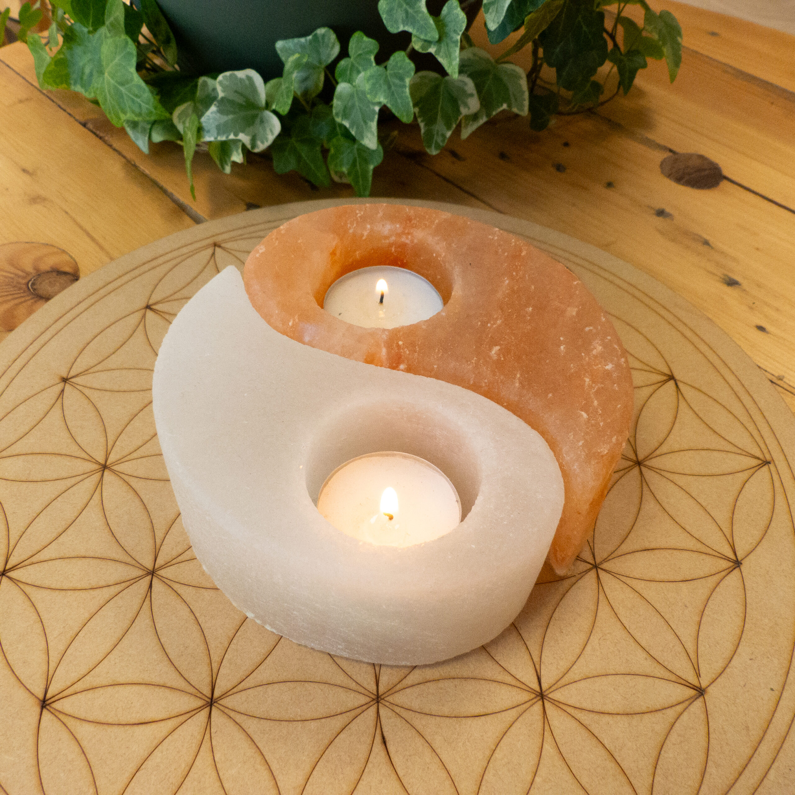 Bougeoir en Sel de l’Himalaya, Yin Yang, de 2 couleurs différentes, pour deux bougies chauffe plat.