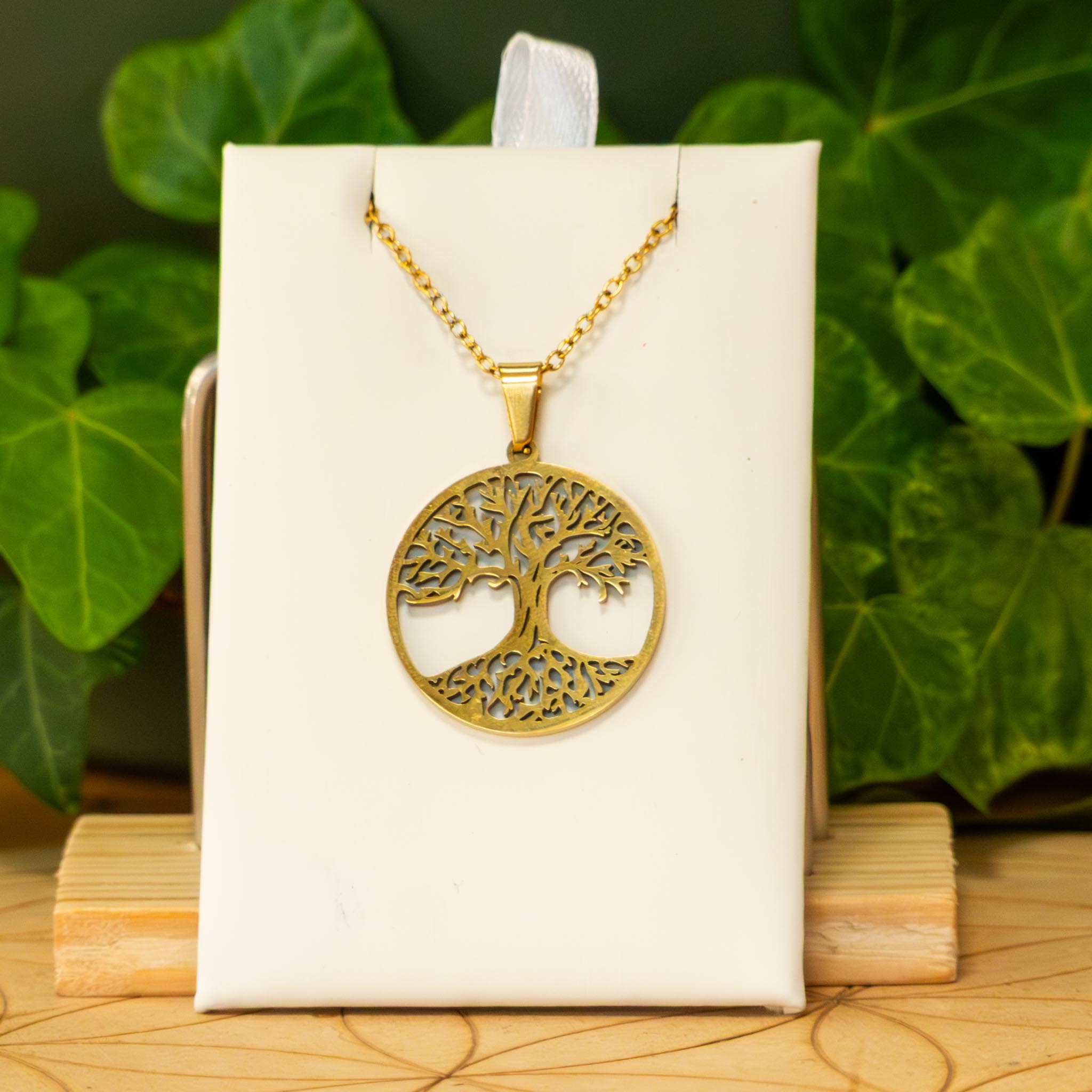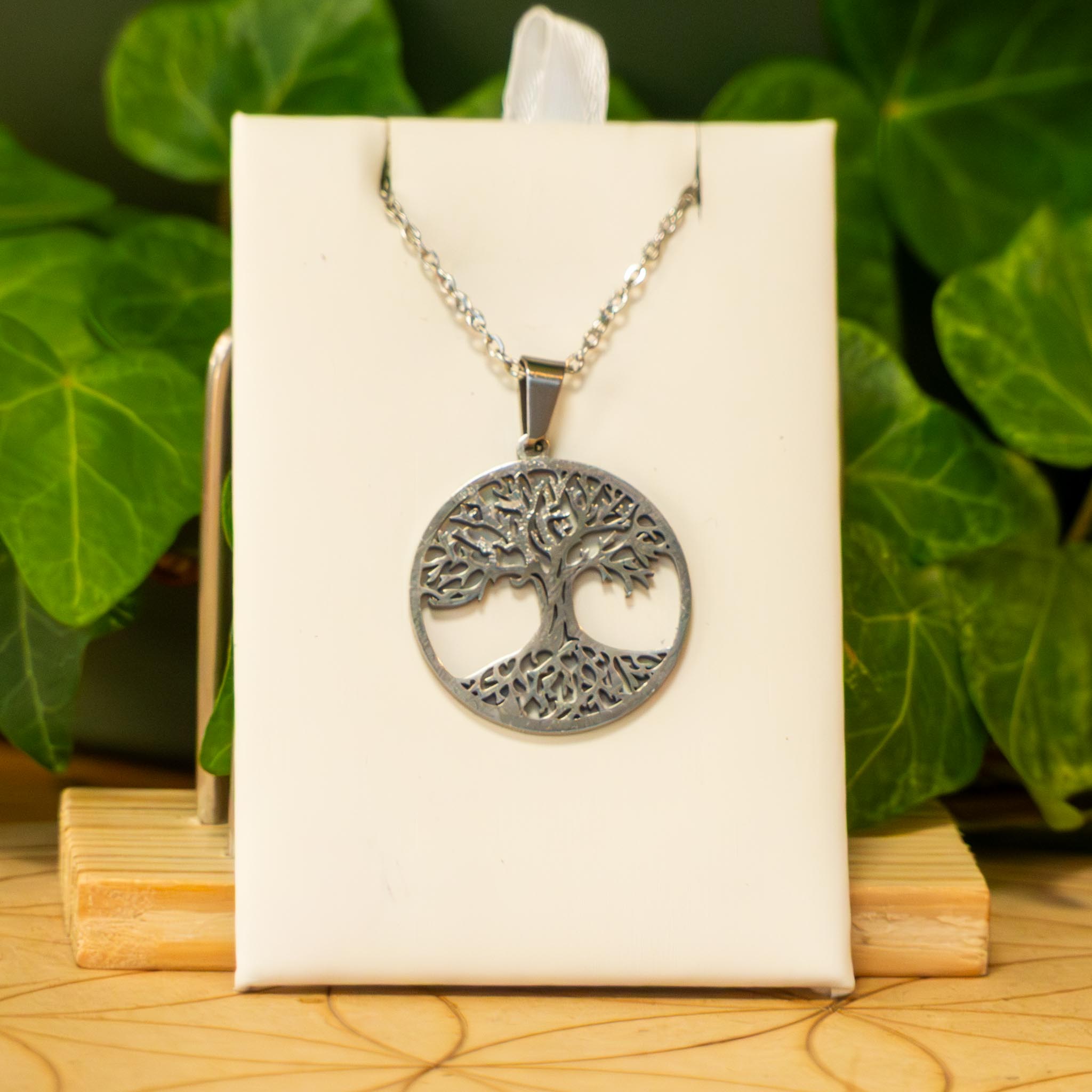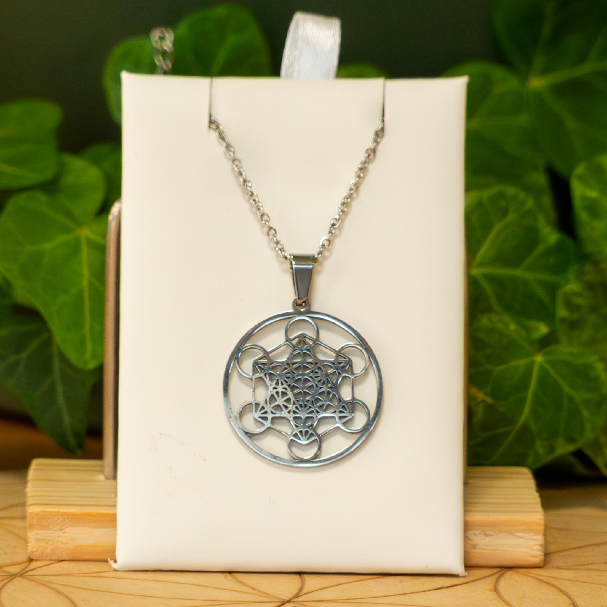 Collier en acier inoxydable argenté ou doré environs 50 cm, pendentif arbre de vie ou cube de Métatron, fermoir mousqueton.