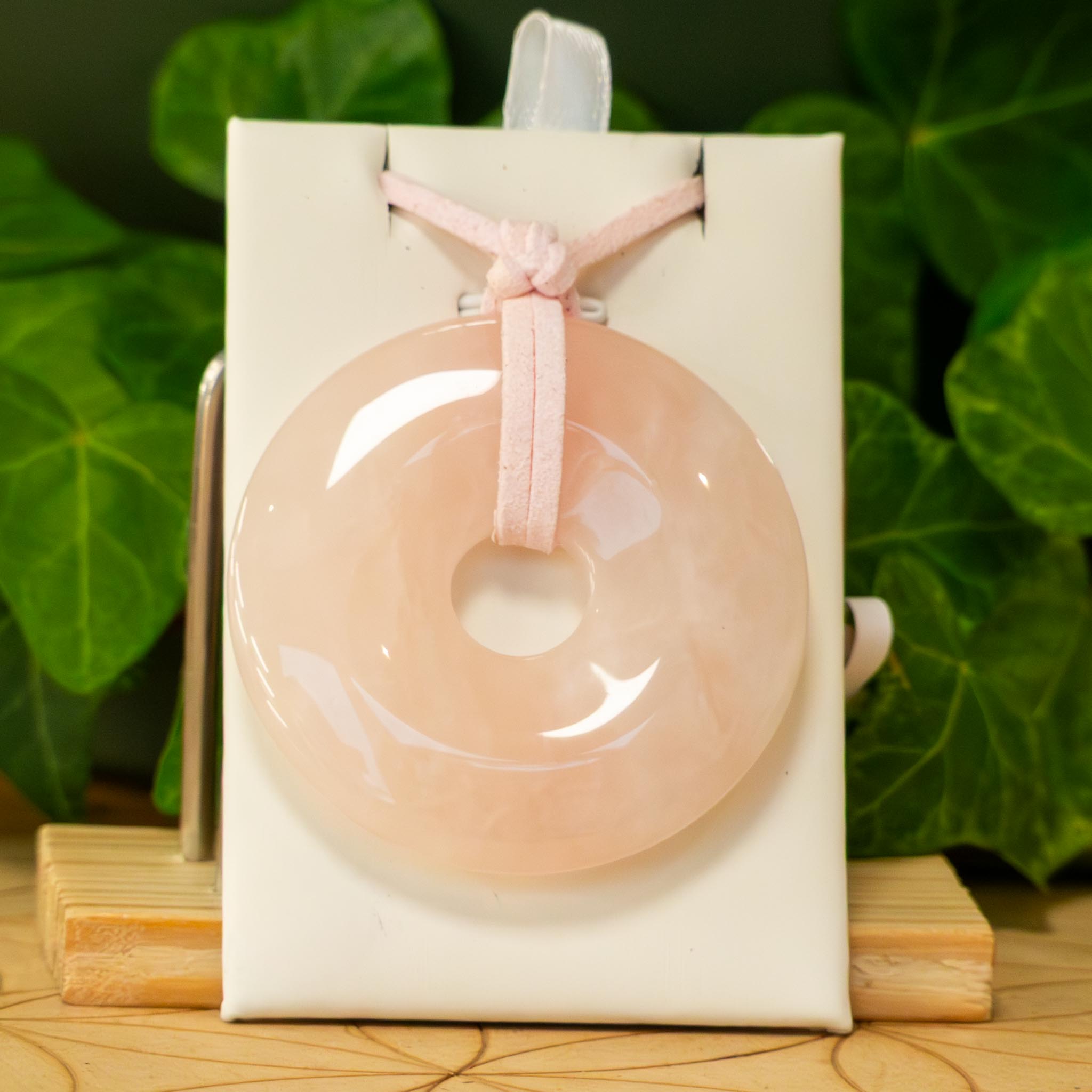 Collier avec pendentif en Quartz Rose en forme de donut diamètre environs 5 cm, cordon en cuir rose environs 65 cm section carrée, fermé par un nœud.